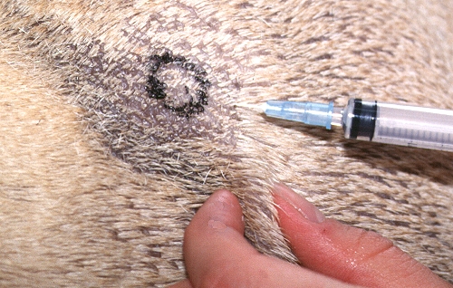 . Injection de l'anesthésique local dans le tissu sous-cutané sous- jacent à la lésion à prélever.