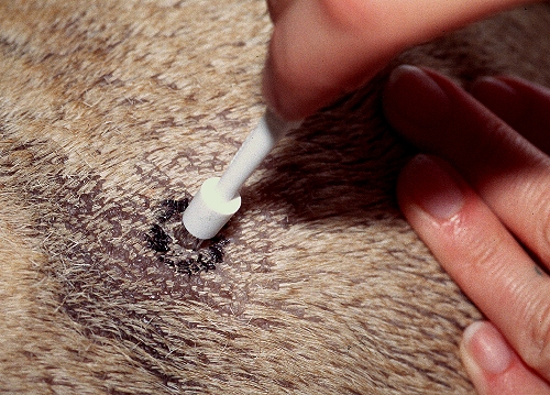 . La peau autour du site à prélever est légèrement tendue avec le pouce et l'index et le trocart à biopsie est fermement appliqué perpendiculairement à la peau et centré sur la lésion.