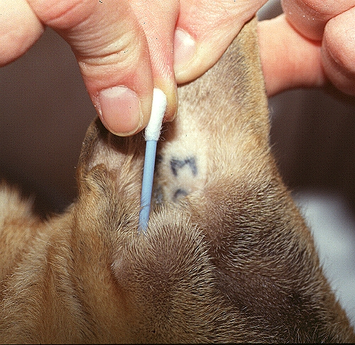 Le pavillon de l'oreille fermement maintenu, l'écouvillon est délicatement roulé sur la paroi interne du canal afin de prélever de l'exsudat puis est rapidement retiré.