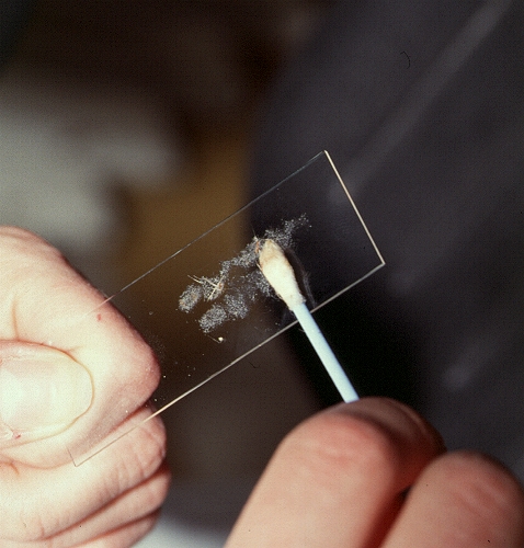 L'écouvillon est roulé plusieurs fois sans frotter sur toute la longueur de la lame microscopique