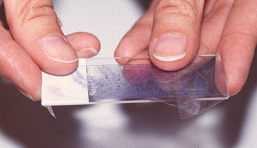 Une fois séche, une extrémité de la bande collante est détachée et est retournée sur la lame de façon à ce que la surface collante soit appliquée directement sur le verre.