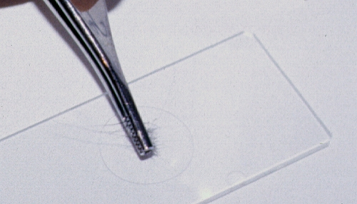Les poils recueillis sont transférés sur la lame de façon à ce que toutes les racines soient alignées.